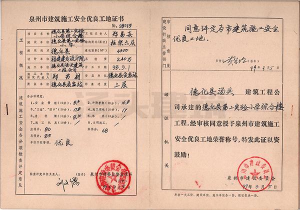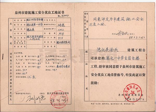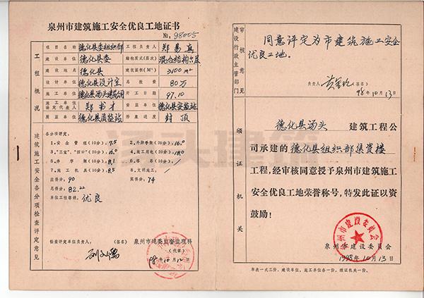 1998年 德化县委组织部集资楼-泉州市施工安全优良工地证书