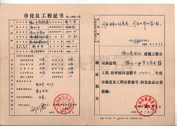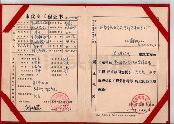 1998年 德化一中学生宿舍楼-市优良工程证书