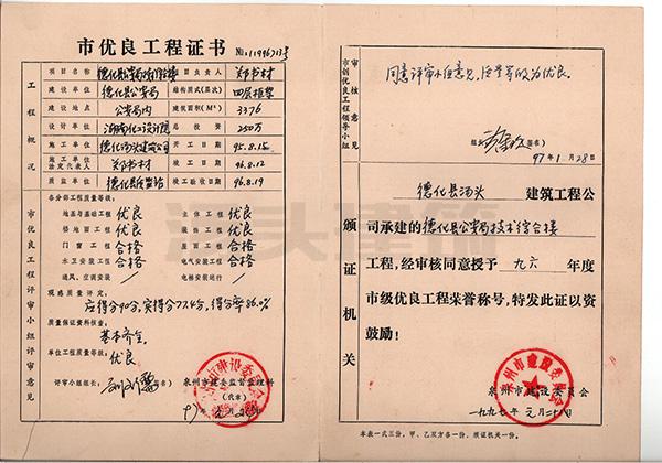 1996年 德化县公安局技术综合楼-市优良工程证书