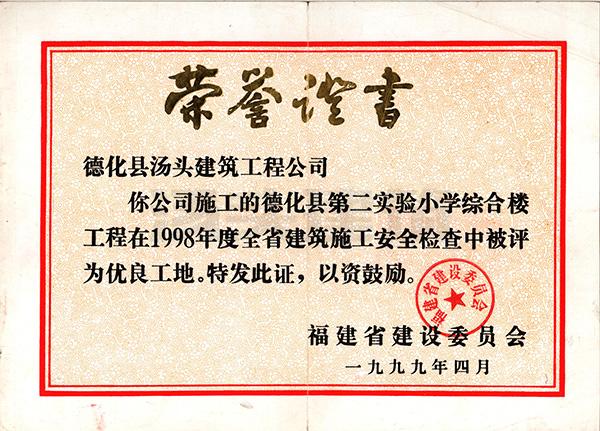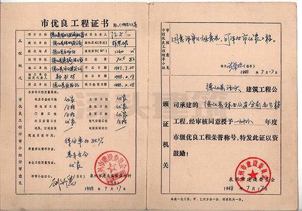 1998年 德化县林业公安分局办公楼-市优良工程证书