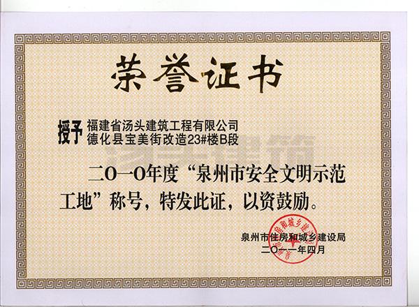 2010年 德化县宝美街改造23#楼B段-泉州市安全文明示范工地证书