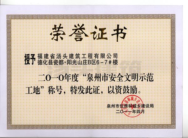 2010年 德化县瓷都阳光山庄B区6-7#楼-泉州市安全文明示范工地证书