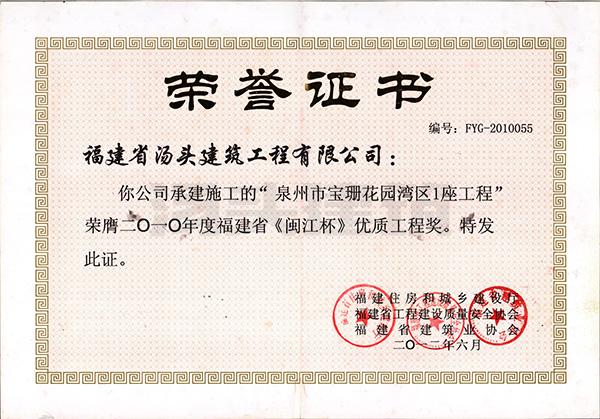 2010年 泉州市宝珊花园湾区1座工程-闽江杯优质工程奖证书
