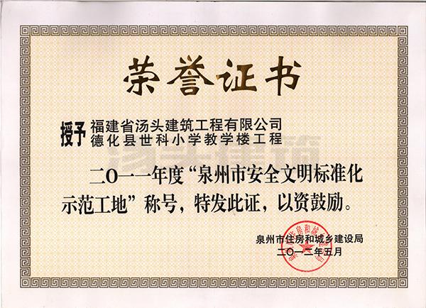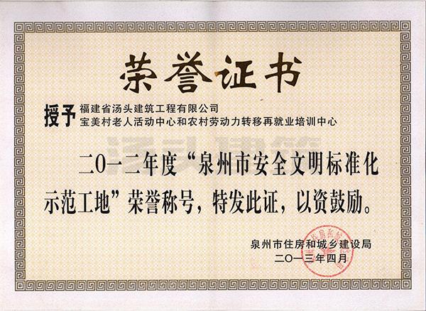 2012年 宝美村老人活动中心和农村劳动力转移再就业培训中心-泉州市安全文明标准化示范工地证书
