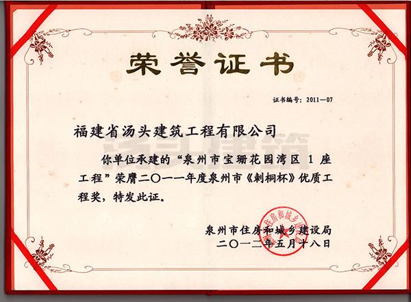 2011年 泉州市宝珊花园湾区1座工程-刺桐杯优质工程奖证书