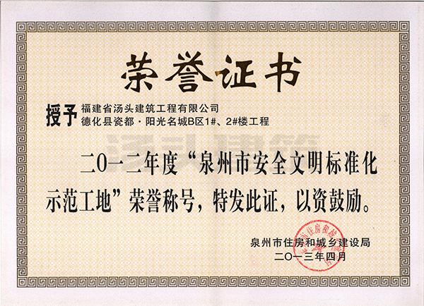 2012年 德化县瓷都阳光名城B区1#2#工程-泉州市安全文明标准化示范工地证书