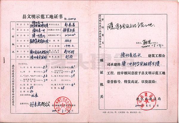 2000年 德化县一中科学实验综合楼-县文明示范工地证书
