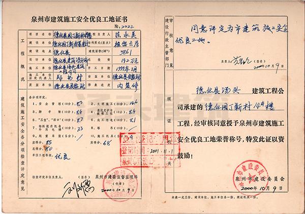 2000年 德化县园丁新村14#楼-泉州市安全优良工地证书