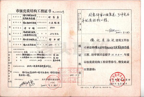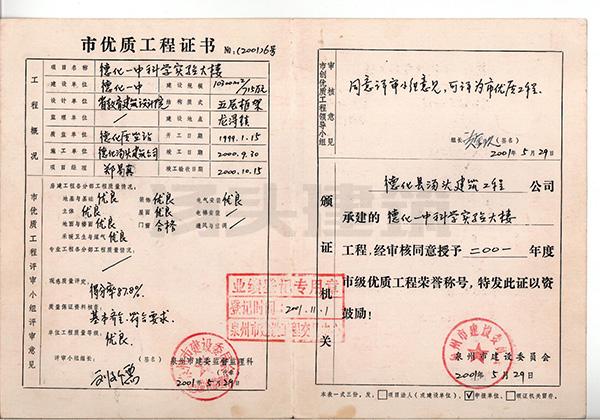2001年 德化一中科学实验大楼-市优质工程证书