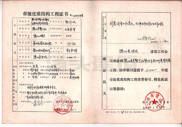 2001年 德化陶瓷职业学院普通教学楼-市级优质结构工程证书