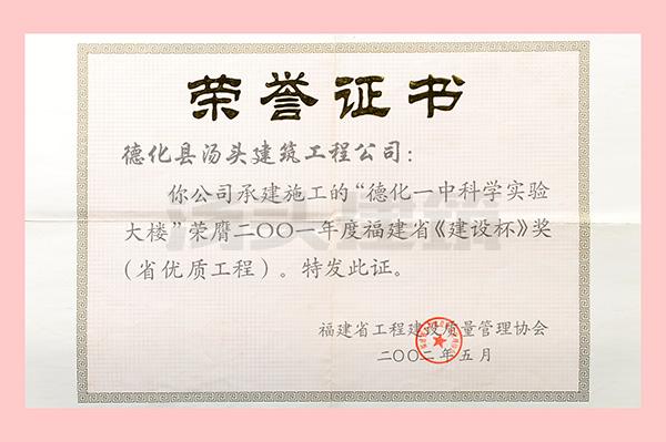 2001年 德化一中科学实验大楼-建设杯省优质工程证书