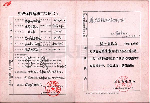 2001年 交警大队摩托车检测线综合楼-县级优质结构工程证书