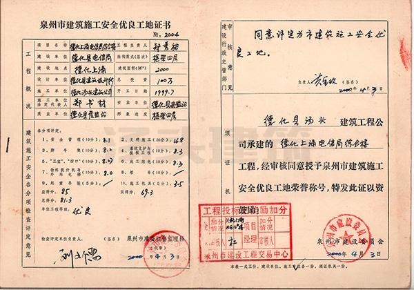 2000年 德化上涌电信局综合楼-泉州市安全优良工地证书