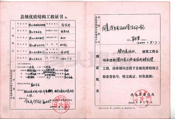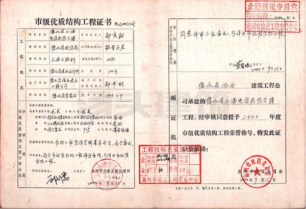 2000年 德化上涌电信局综合楼-县级优质结构工程证书