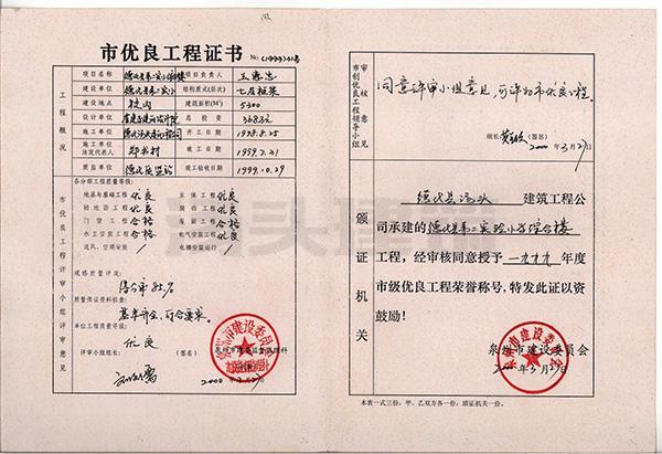 1998年 德化一中学生宿舍楼-市优良工程证书